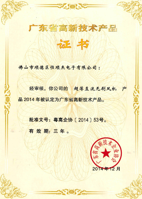 直流風機產品高新技術證書