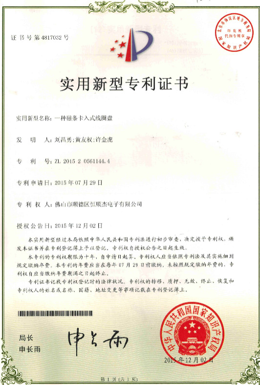 一種磁條卡入式線圈盤專利證書.